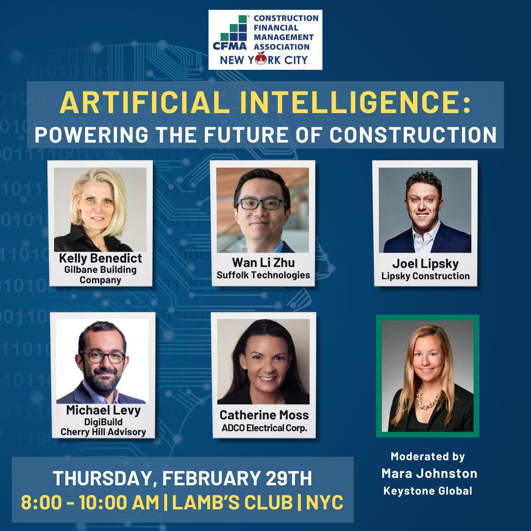 Join us for Thursday, February 29th at The Lamb's Club for breakfast and a panel discussion that will explore the intersection of Artificial Intelligence and the construction industry. Gain valuable insights, connect with industry peers and experts, and be part of the conversation shaping the future of construction!
